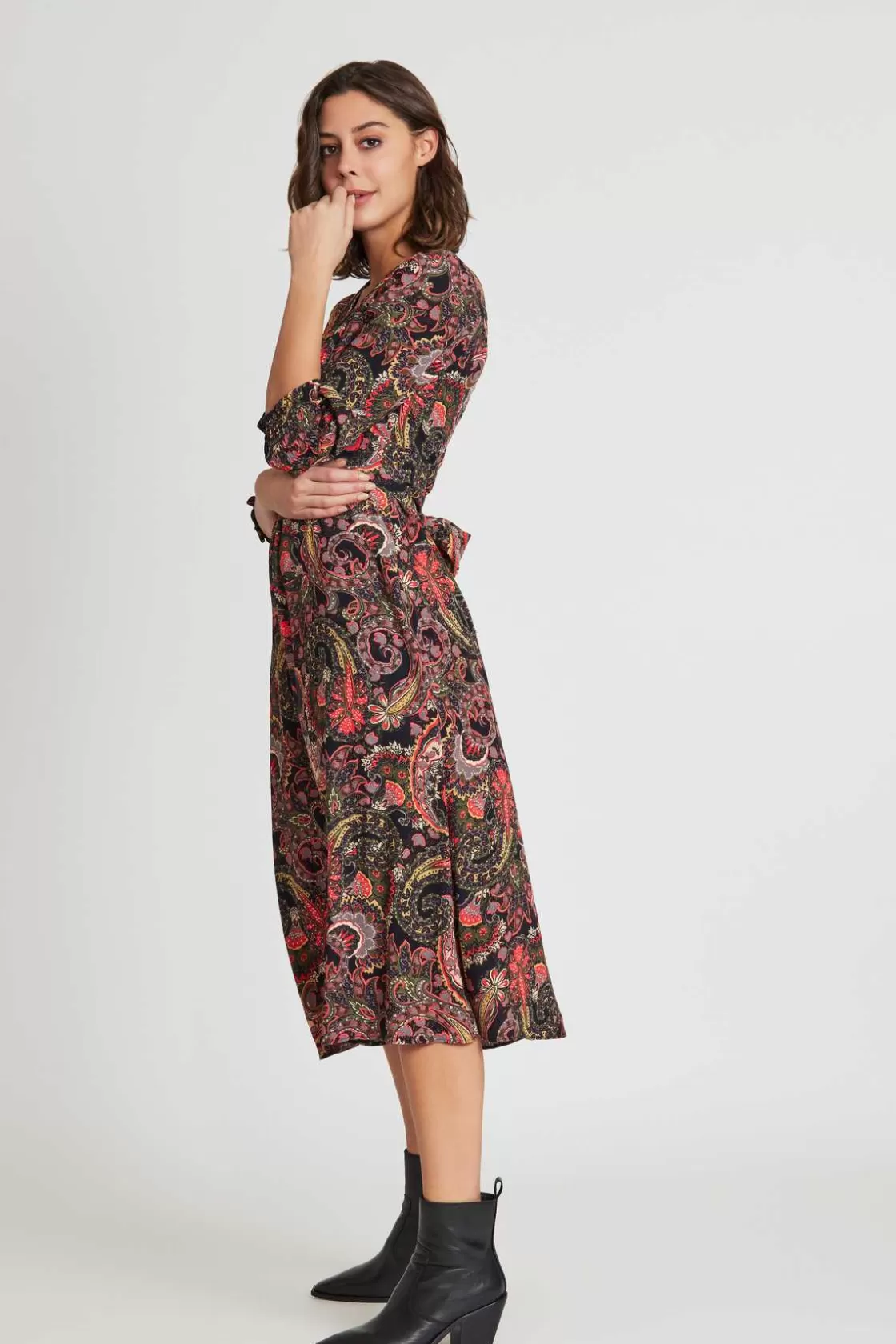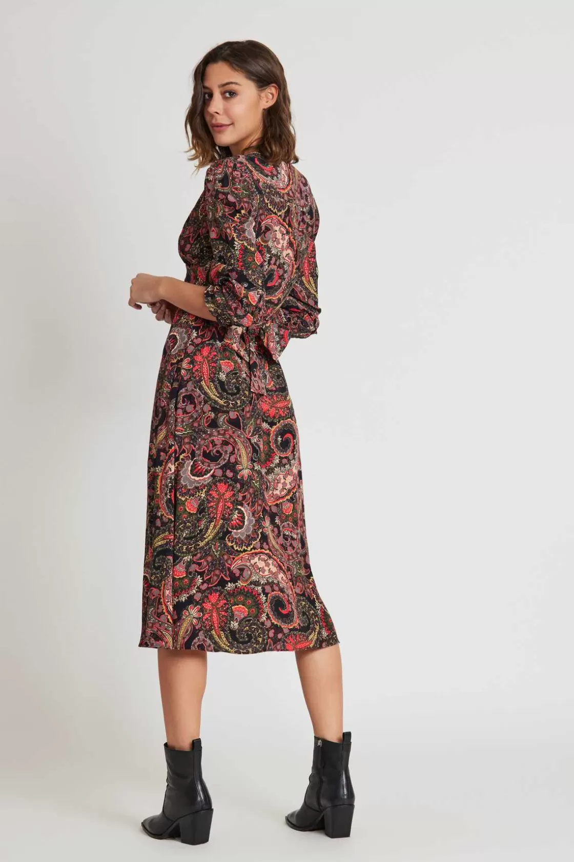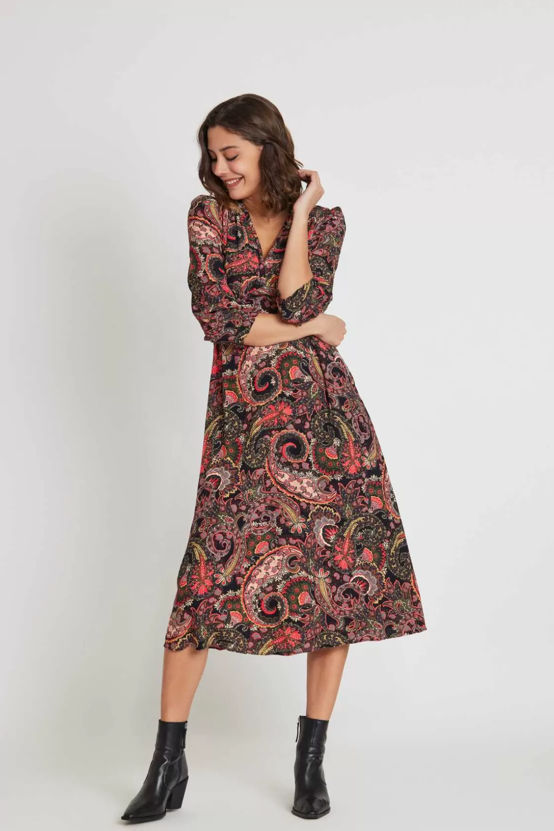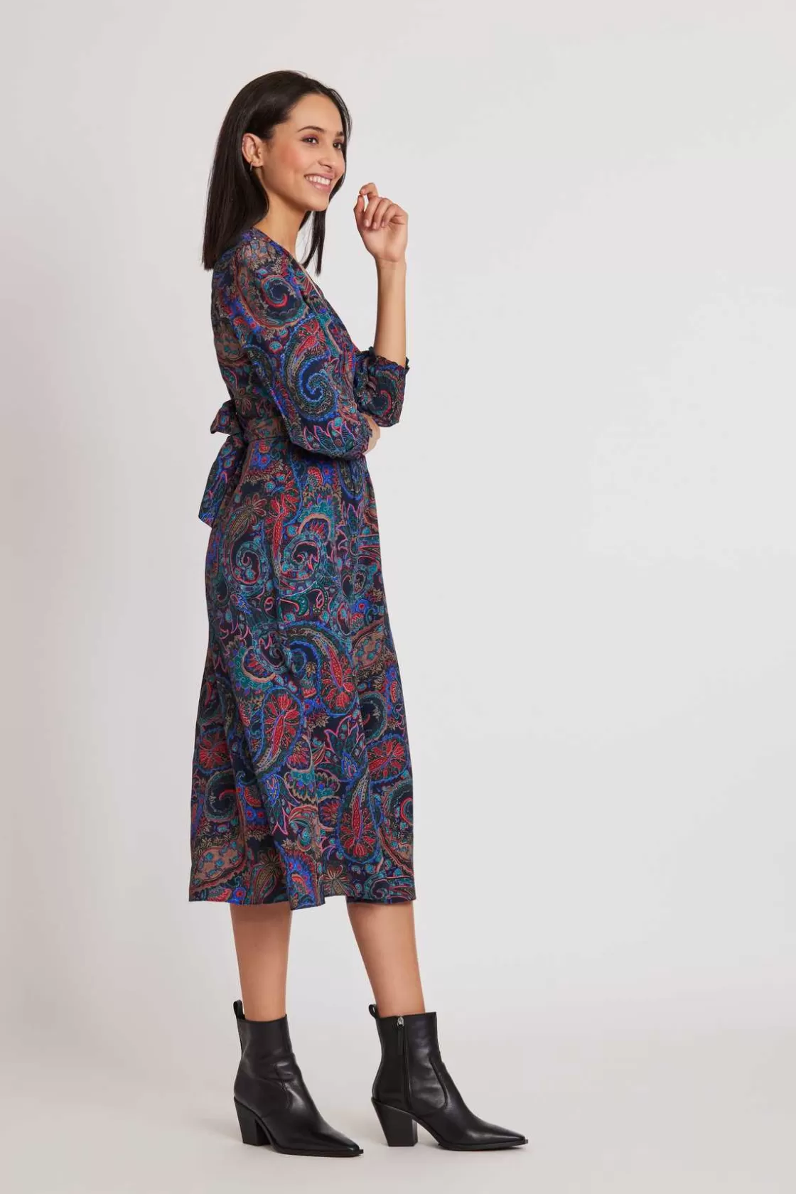 Robe midi col V manches 3/4 en crêpe viscose, imprimé Paisley. Ceinture fixe à nouer dans le dos. Sequins et passemen…